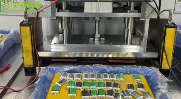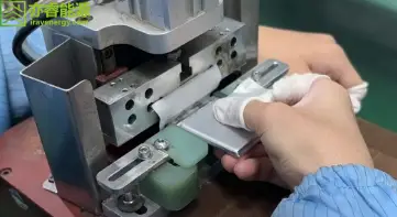 Cells with protective films are individually placed into fixtures of specified thickness and width to ensure each cell’s dimensions meet design requirements.